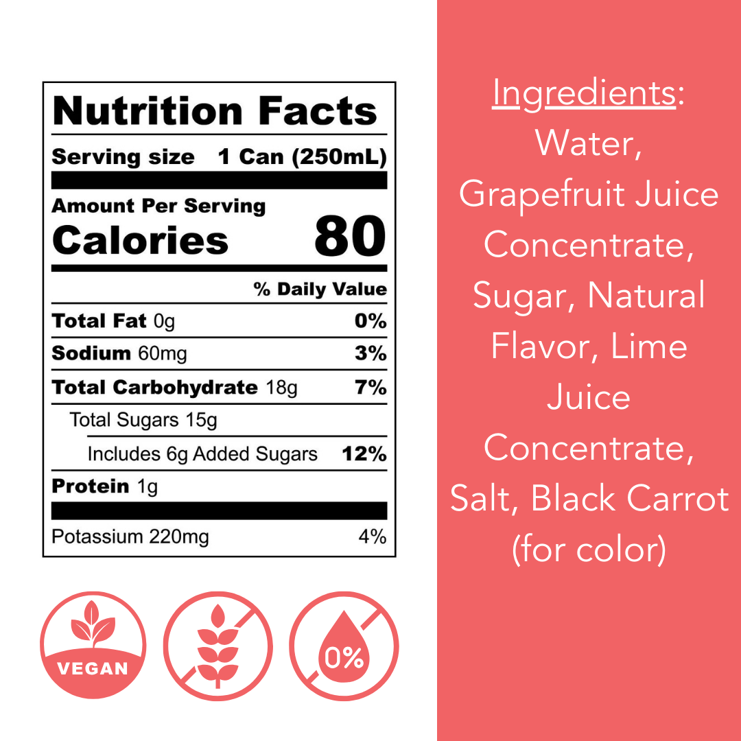 Water, Grapefruit Juice Concentrate, Sugar, Natural Flavor, Lime Juice Concentrate, Salt, Black Carrot (for color)